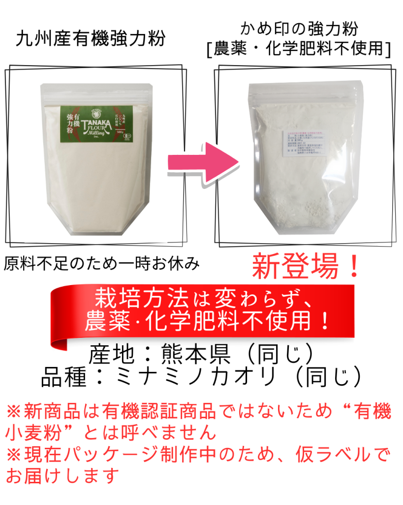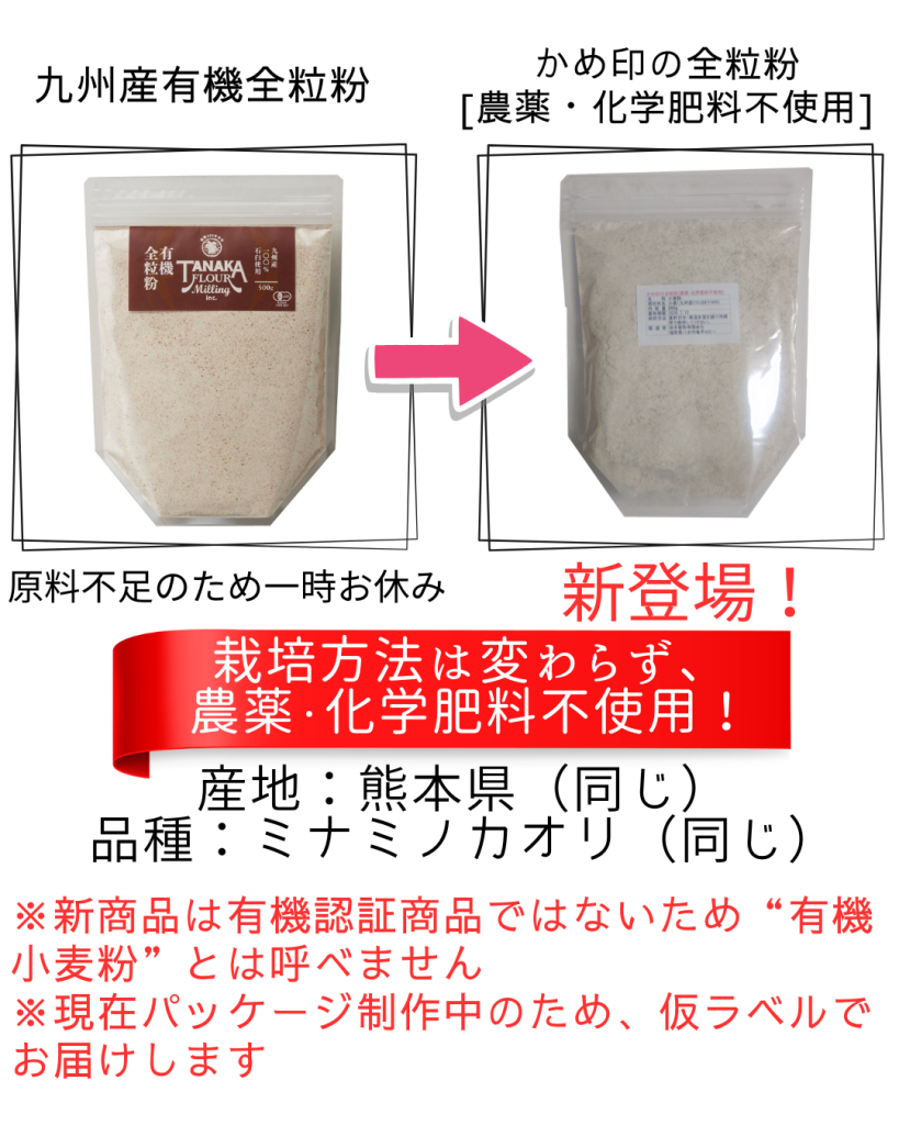 現在、ご好評をいただいております「九州産有機全粒粉 500g」「九州産有機強力粉 500g」につきまして、原料である有機小麦の在庫が残り僅かとなっております。誠に勝手ながら一時販売を休止し、3月13日(金)より、同等の品質を持つ代替商品の販売を開始させていただきます。